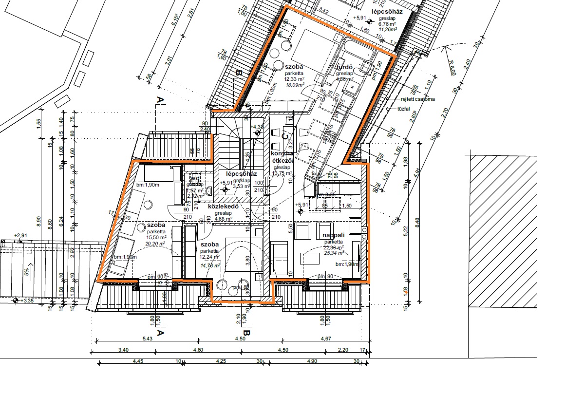 Padlóburkolatok: greslap és laminált parketta, helyiségenként kijelölve